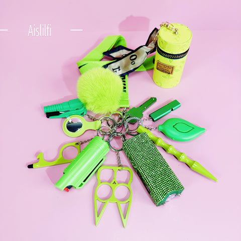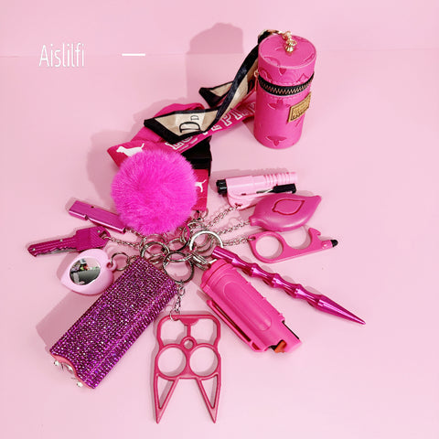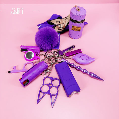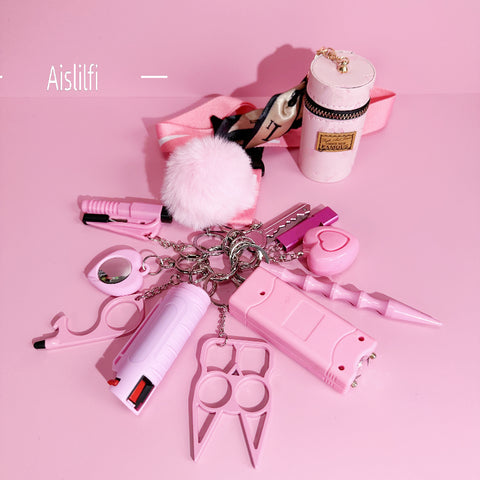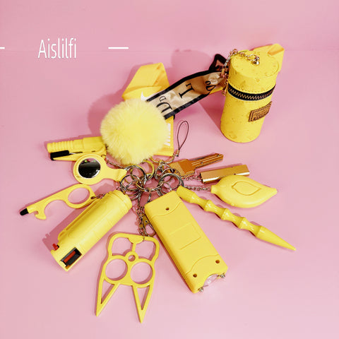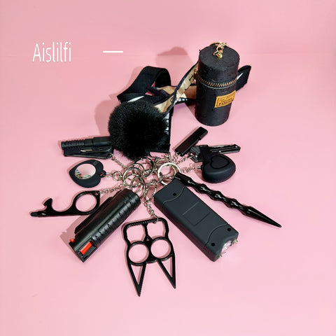Schlüsselband, Pfefferspray, Lippenstift-Aufbewahrungseimer, Alarm, Taser-Pistole, Bluetooth-Finder, Kubaton, Katzenohren (gedämpftes Brot in Katzenohrenform), Fensterbrecher, Türöffner, Pfeife, Schlüsselmesser, Pompon
