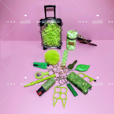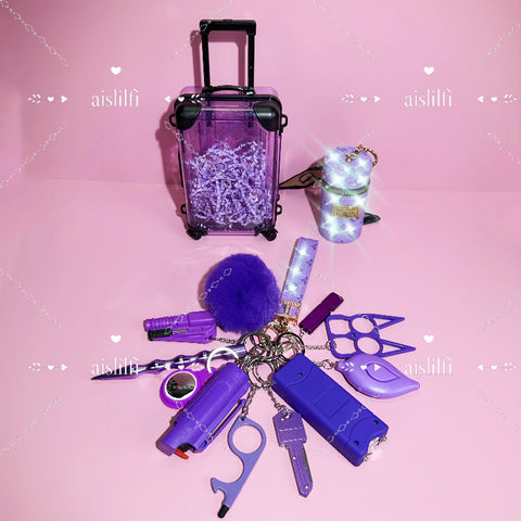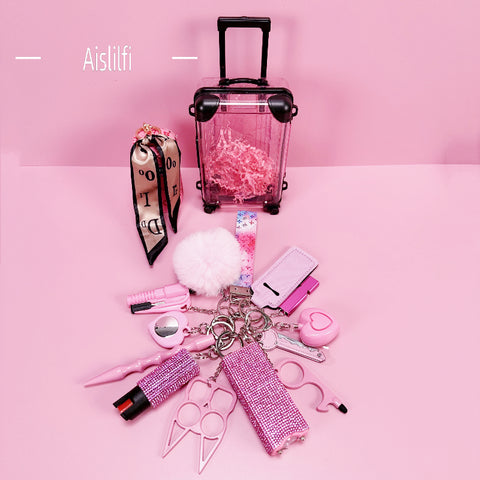 Neuer Koffer, Schlüsselanhänger, Pfefferspray, Alarm, Ortungsgerät, modischer Lippenstifteimer, Taser, Kubaton, Katzenfinger, Fensterbrecher, Schlüsselmesser, Türöffner, Outdoor-Pfeife, Pompompon.