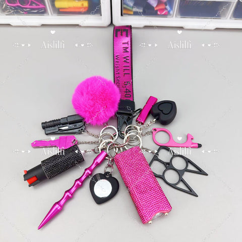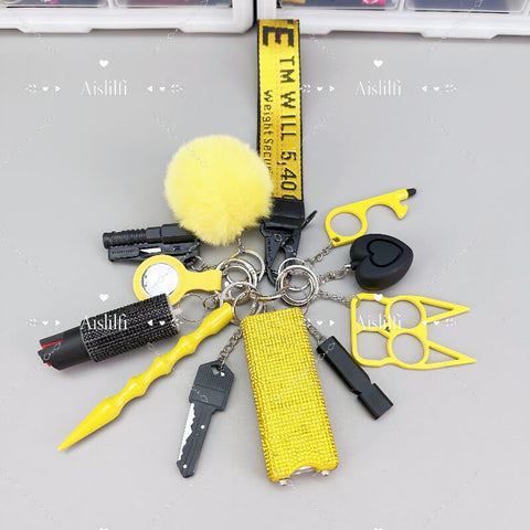 Spray, Kubaton, Window Breaker, Cat's Ear, Door Opener, Whistle, Key Knife, Pom Pom,Flashing Light, Alarm, Bluetooth Tracker, Braided Keychain